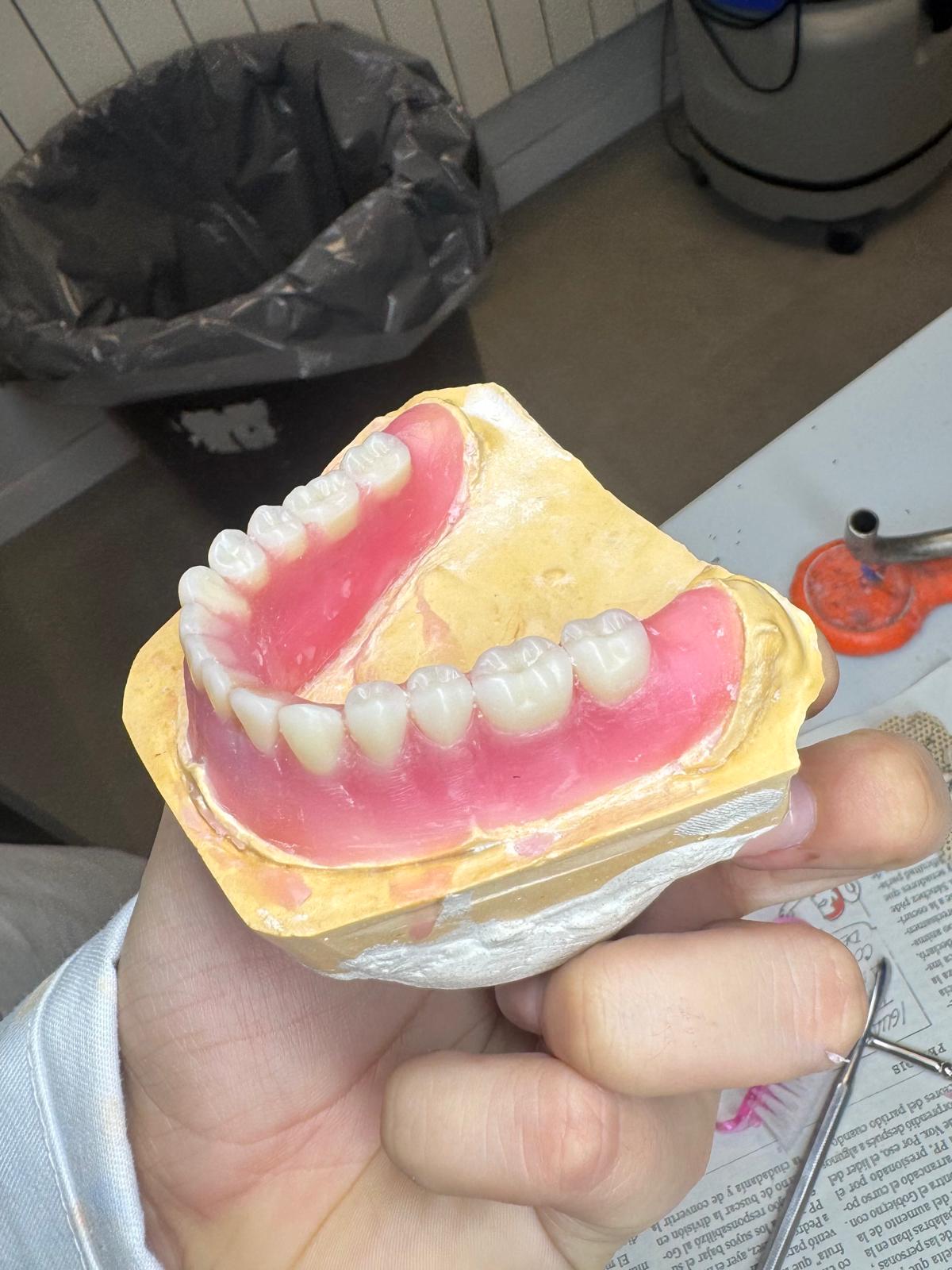 - Colocaremos cera por todo el modelo dándole forma a la prótesis y colocaremos los dientes, dando forma anatómica a la encía y fijándonos que todos los dientes olcuyan unos con otros y que no haya espacios entre ellos.